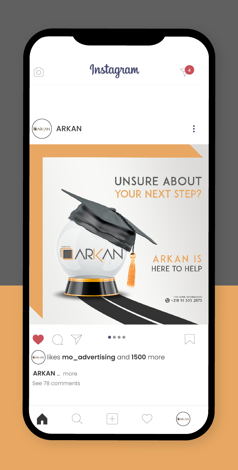 Arkan Educational Consultancy was established in Libya with a mission to provide foundational support to students and professionals as they navigate their educational and career paths. Through personalized guidance and expertise, Arkan empowers individuals to confidently pursue their goals, knowing they have a solid support system behind them. Our job was to work on Arkan’s full corporate identity including its logo concept, business cards design along with social media platforms including content, artworks and designs.