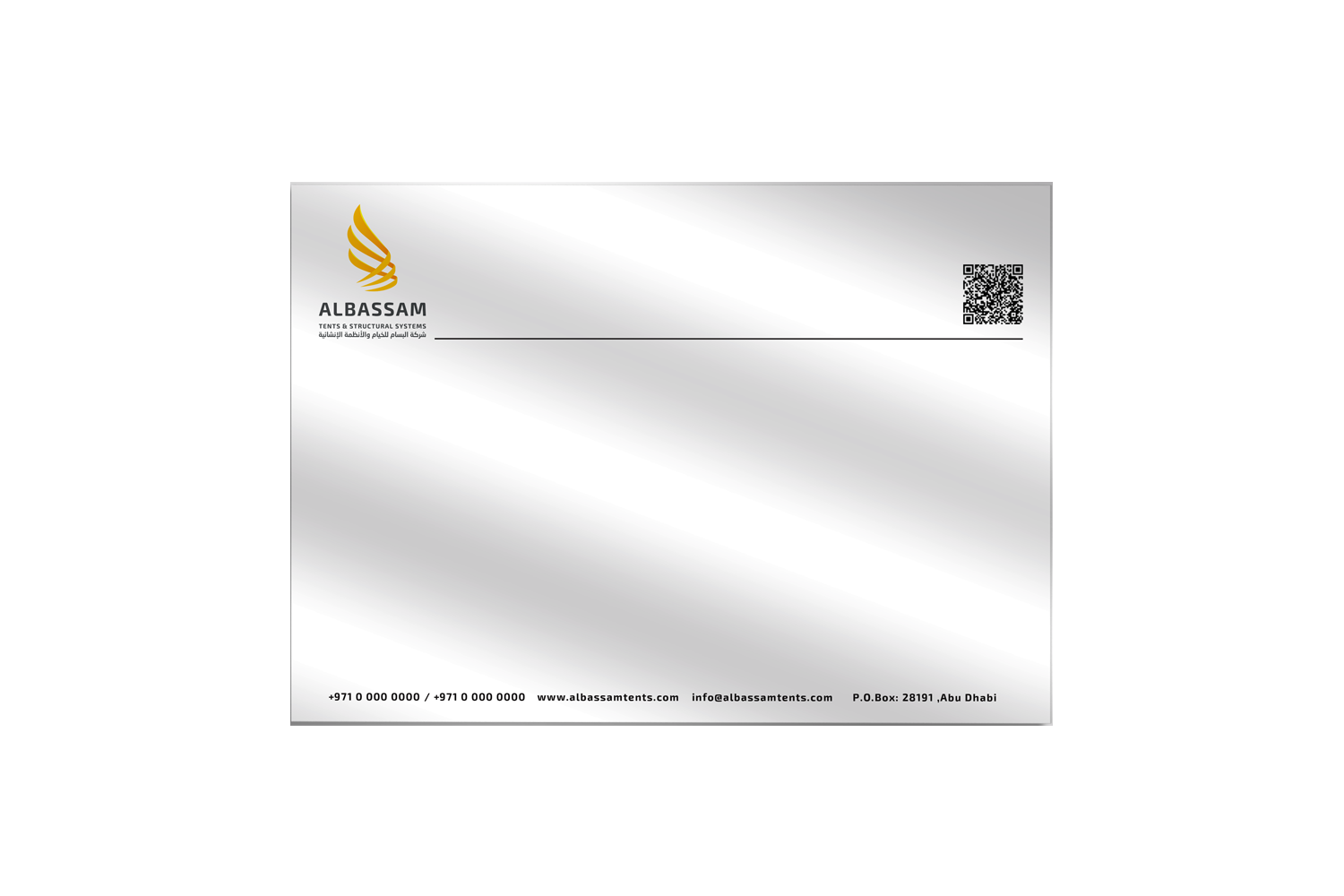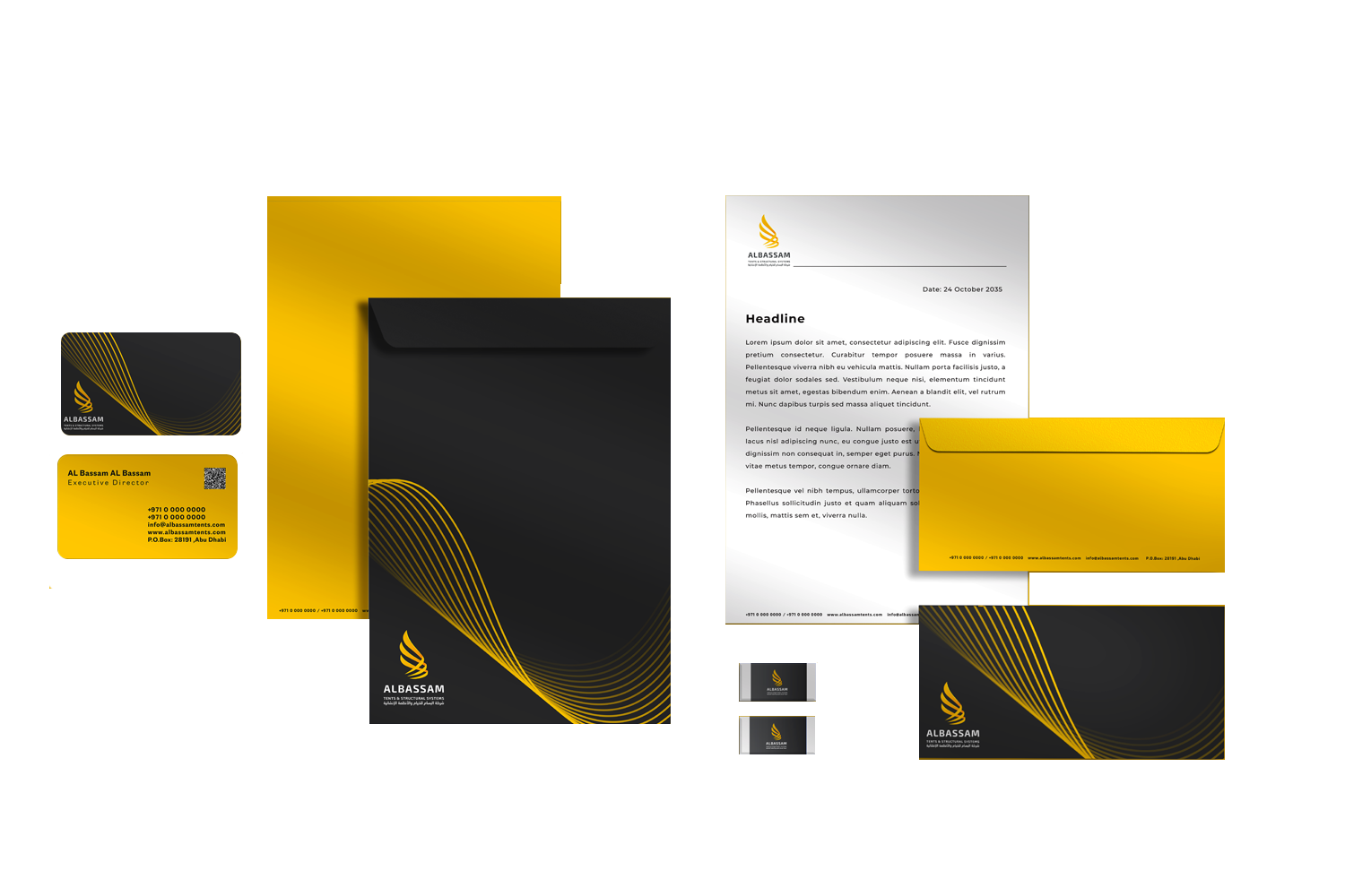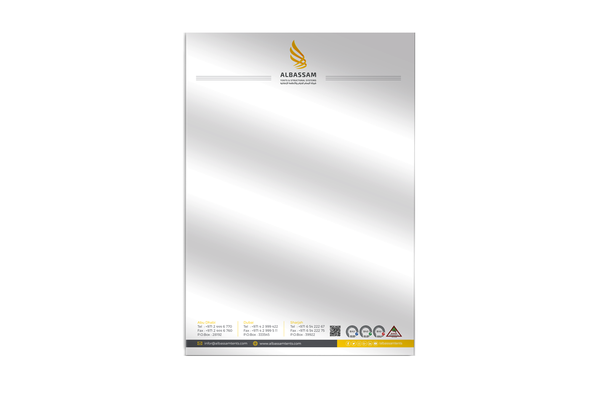 Al Bassam tents & structural systems is a company based in UAE that provides wide variety of geometric shapes affluent tents, car’s umbrellas, sophisticated and modern Sails engineering that suits customers. Our job was to work on Al Bassam’s re-branding including stationary designs along with modern promotional items.
